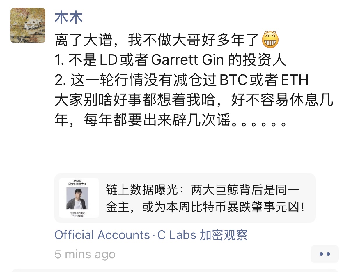Foresight News 消息,火币创始人李林在朋友圈发文表示,自己并非 LD 或 Garrett Gin 的投资人,本轮行情中也未减仓比特币或以太坊,并称外界不应将相关市场传言与其本人联系。他表示,自己已休息多年,但几乎每年仍需就相关传言进行澄清。