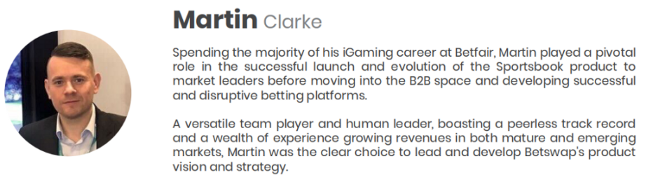 产品总监 MARTIN 之前在 betfair 工作,并与许多体育博彩公司合作,BEOFRE 加入 betswap。