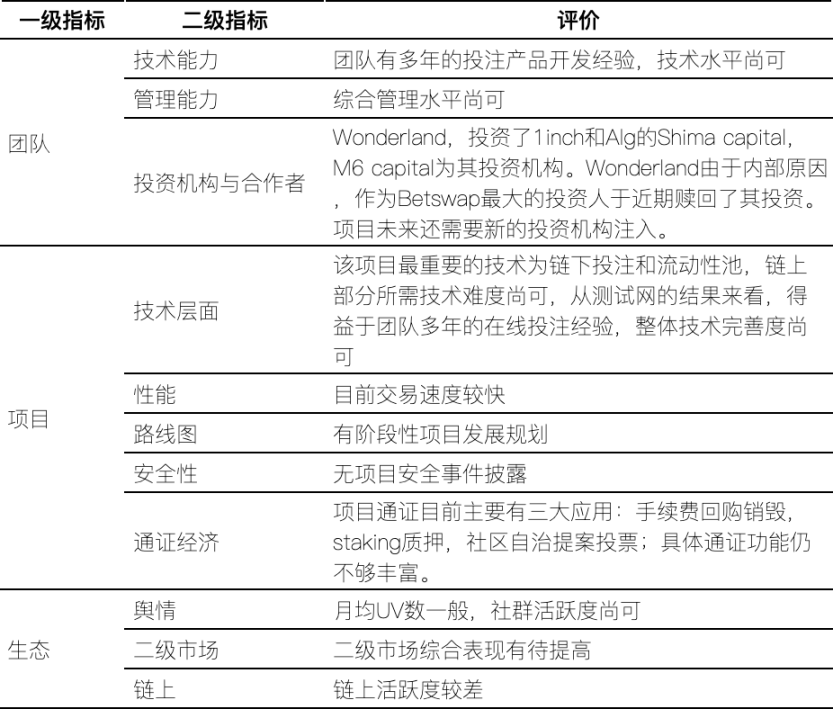 该项目已启动一年,从技术和产品角度上 Betswap 拥有了良好的基础,大部分的主要功能已经推出,并且有重要意义和 NFT 游戏也即将完成开发。由于 Betswap 披露的交易平台盈利模式和目前的交易情况,Betswap 可能面临一定的集中化,流动性和合规性风险。该项目正处于发展过程中,仍有很大的改进空间。 该项目的投注流动性挖矿和交易所上线进度和成果,将是该项目能否成功的关键节点。