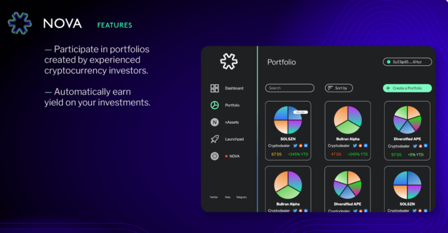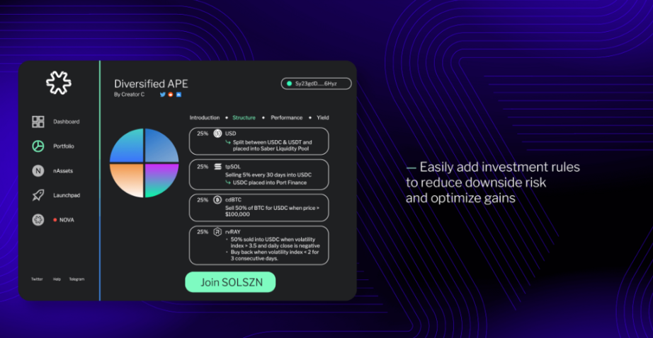 在 Nova Finance 的 MVP 中,用户可以用一系列基于 Solana 的资产创建投资组合,未来还将增加更多的区块链和资产类型。