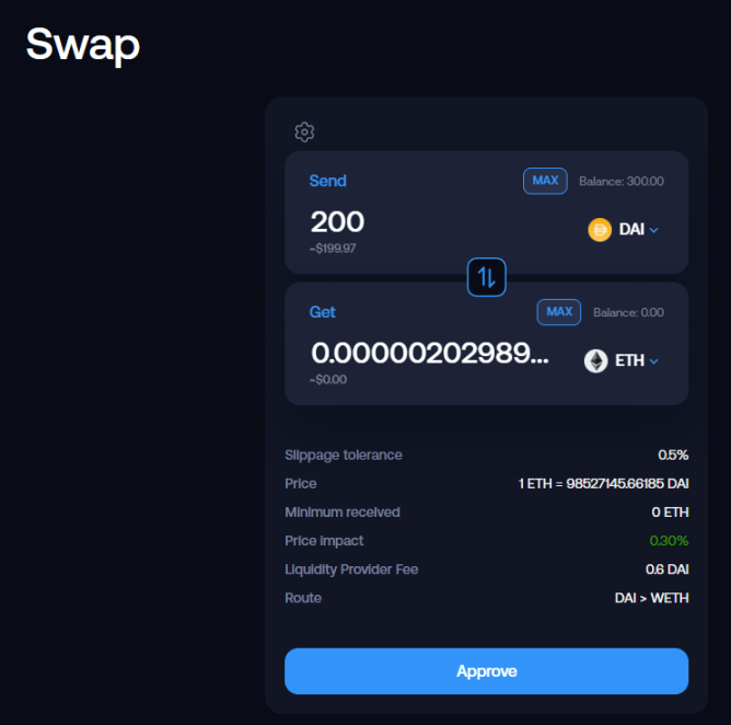 5、转到 Switch 测试网https://testnet.switch.mute.io/,并再次将钱包连接到 zkSync 2.0 测试网。然后换好 DAI 和 ETH。