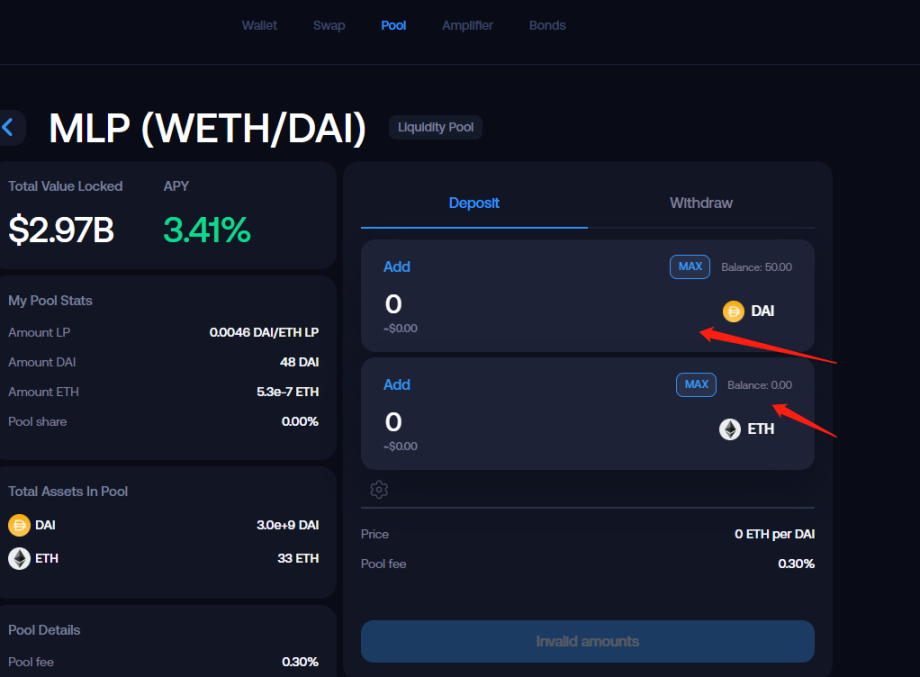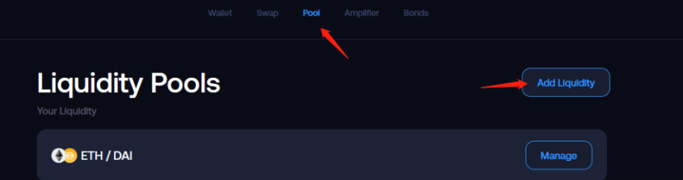 6、进入 POOL 点击 ADD LIQULDITY 把 ETH 和 DAI 组成 LP,按步骤操作即可