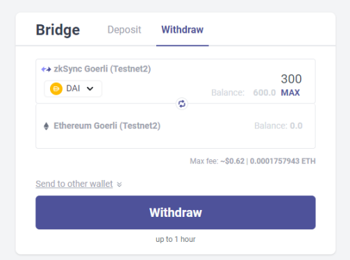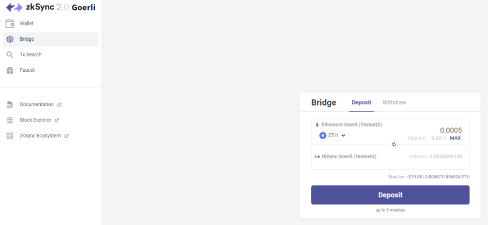 3、存款,在获得测试币后,我们就可以来到bridge选项,将领到的几种测试币转出、转入 zkSync 测试网。