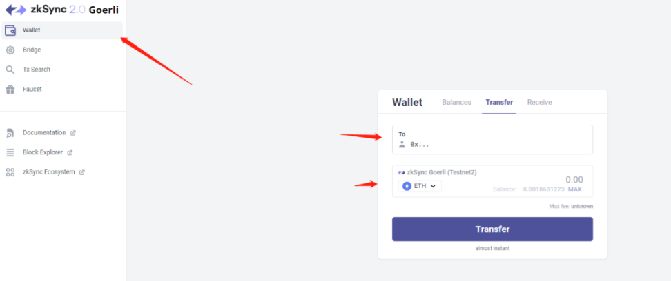 4、L2 转账,在将测试币转到 zkSync 后,我们就可以在 Layer 2 转移资产了。点击 TWallet 然后按步骤操作,确认后页面会提示切换到 zkSync Testnet,按提示操作即可。