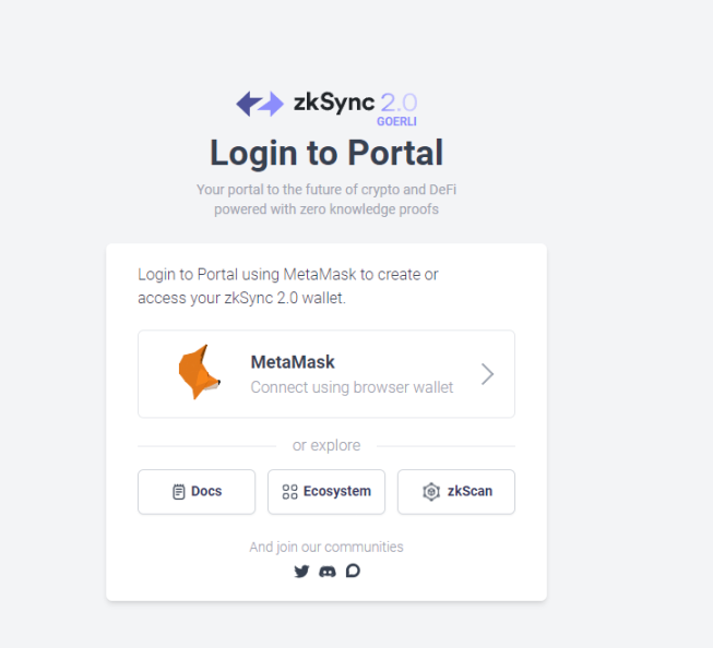 1、进入测试网https://portal.zksync.io 并连接我们的 Metamask 钱包。系统会自动要求添加 Goerli 网络,然后签名即可