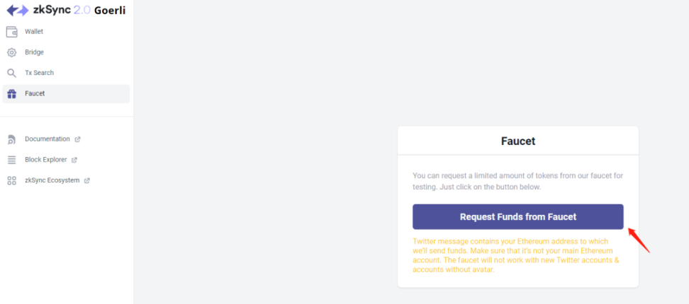 2、领取测试网 ETH,如果钱包里还没有 Goerli 测试网的 ETH Token,可以点开左侧的「Faucet」选项领取。