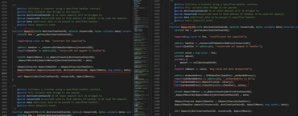 在上图中,deposit和depositETH方法都是存款方法,但是当用deposit方法存款时,并没有验证该存款是否为原生代币。当攻击者进行存款时,传入WBNB地址。该方法不验证WBNB存款,之后调用deposthhandler .deposit方法成功绕过判断条件。最后,攻击者利用该漏洞成功获取大量资金。