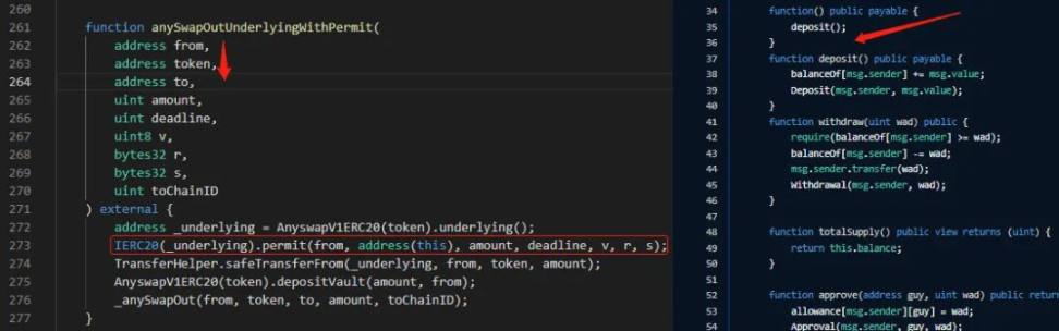 在上图中的AnySwapOutUnderlyingWithPermit方法中,前三个参数都是由调用者传入的,也就是说代币和其他参数都是攻击者控制的。当参数可控时,攻击者部署攻击合约来转移受影响的代币。合约地址被设置为基础代币参数。