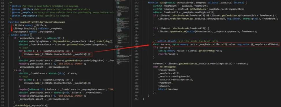 上图中的swapAndStartBridgeTokensViaCBridge方法中,传入的_swapData参数没有严格限制。在同一个LibSwap.swap调用中,该值不受严格限制。因此,在swap方法中,_swapData可以成功地调用call方法来执行恶意操作。攻击者利用此漏洞进行多次调用以获取资金。