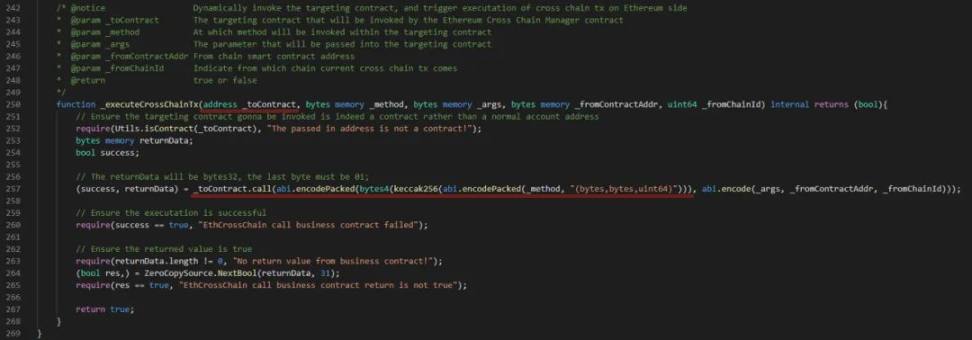 在上面的图中,_executeCrossChainTx方法没有对传入的参数施加严格的限制,这导致攻击者传入toContract,方法参数被攻击者控制。由于协议的内部关系,攻击者在哈希冲突后传入与putCurEpochConPubKeyBytes方法相同的方法签名。成功调用EthCrossChainData合约的putCurEpochConPubKeyBytes方法,直接修改中继链验证者的公钥,使其变得可控,然后利用验证者签署恶意的进行资金转移,获取了大量资金。