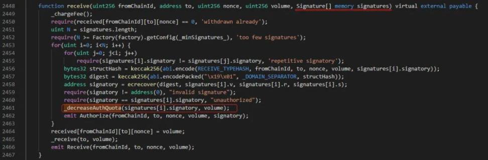 由于接收方法的逻辑和名为ecrecover 和_decreaseAuthQuota方法并不严格检查签名,攻击者使用了自己产生的签名,但后续合约逻辑没有严格判断映射值签名和其他计算。使攻击者成功地执行接收方法,为自己签名转账资金。