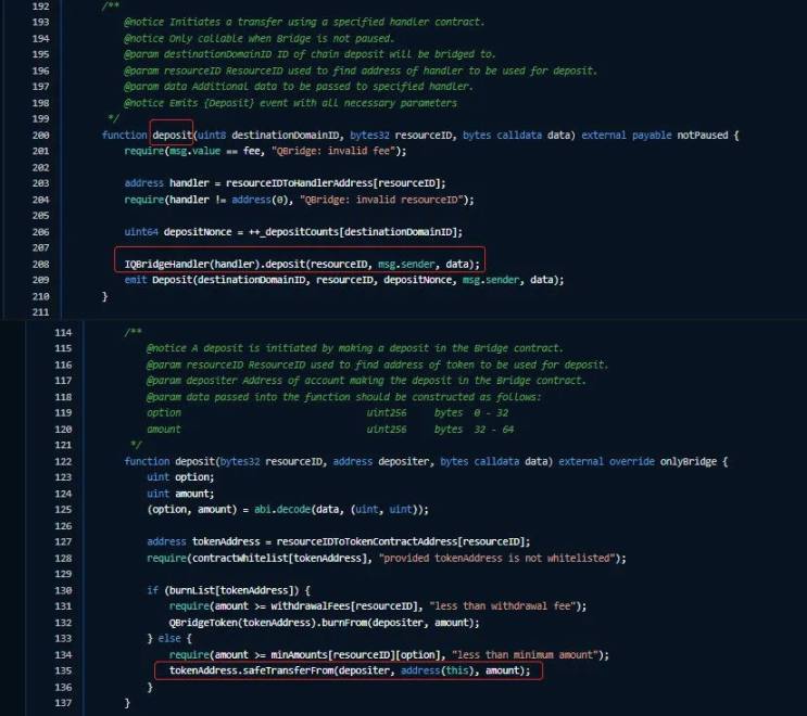 上图中,存款是一种正常的存款方式。当在此方法中调用IQBridgeHandler(handler).deposit时,当用户传入的resourceID映射tokenAddress地址为0地址时,后续的tokenAddress.safeTransferFrom(depositer, address(this), amount);转账将正常执行,导致方法和事件的正常运行,调用者可以成功进行存款。