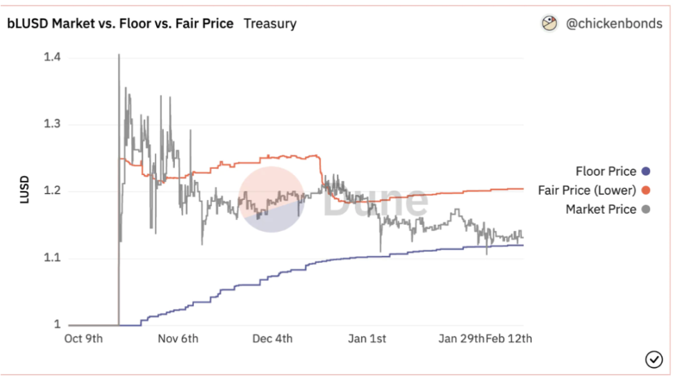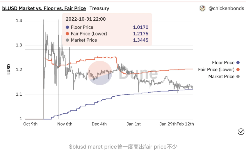 这样 chicken bonds 的系统就可以持续滚动运转起来。下图我们可以看到,项目刚开始时 $blusd maret price 曾一度高出 fair price 不少。