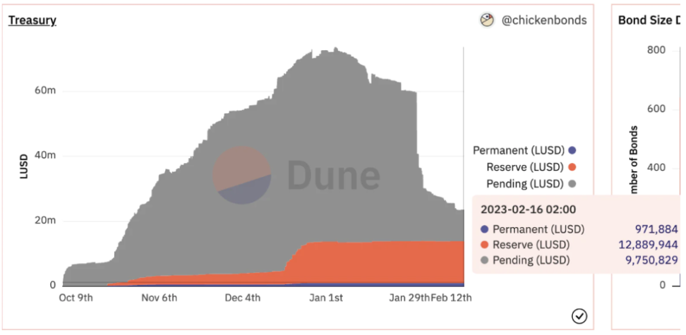 这个机制设计的创意真的非常好,但机制设计者的一切演算并没有在实际应用中成为现实,宏观来看,chicken bonds 几乎没有给 liquity 带来太多正向的外部性效果。协议的 TVL 并没有在 chicken bonds 上线后有太大的改观,在我看来,只能说是原本就放在 stability pool 中的 $lusd 进入到了 chicken bonds,依然是场内资金互搏,导致了初始的高 APR 也只是一种幻象,高速行进的 chicken bonds 车轮逐渐因为现实中的各种摩擦与损耗,最终缓缓停了下来。