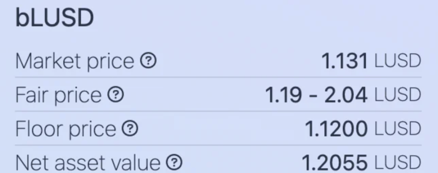 我们能说 chicken bonds 就已经失败了么,现在下定论可能还为时尚早,如果 chicken bonds 打算将 permanent 池子中的 lusd 给到 reserve 池子中,就会立即大幅提升 blusd 的 floor price,直接对标下图中的 net asset value。这是一个潜在 6% 的涨幅收益,风险就是真正跌到目前的 floor price,有一个 0.9% 的下行风险敞口。