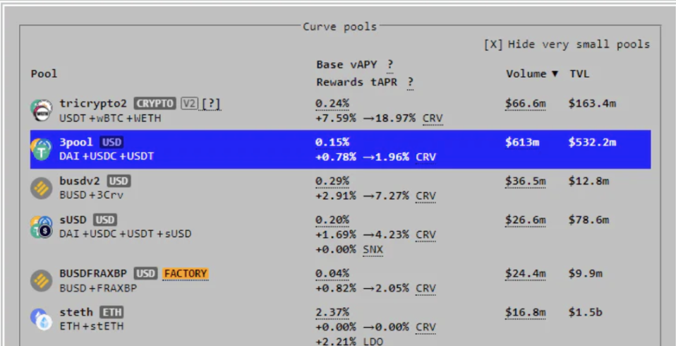 最近一段时间,市场开始对 usdc,busd 甚至 dai 都有了一些 fud,从 curve 的交易量我们就能看出来市场情绪的变化,3pool 24 小时的交易量达到了 6.13 亿美金,甚至超过了池子的 TVL,这真的是相当夸张了。作为加密货币的玩家,我们究竟需要一个什么样的稳定币,才能使我们获得免于恐惧的自由呢,我来好好讲一讲 liquity 这个项目。