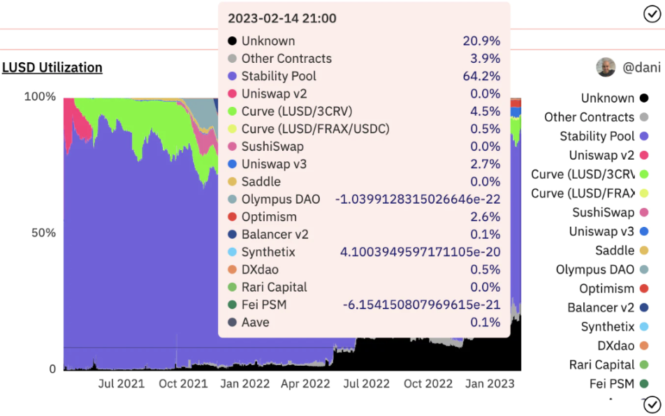 通过 liquity 借出来 $lusd 绝大部分都在 liquity 项目自己的 stability pool 中(一直保持在 60%-70% 之间),而没有用于其他场景。