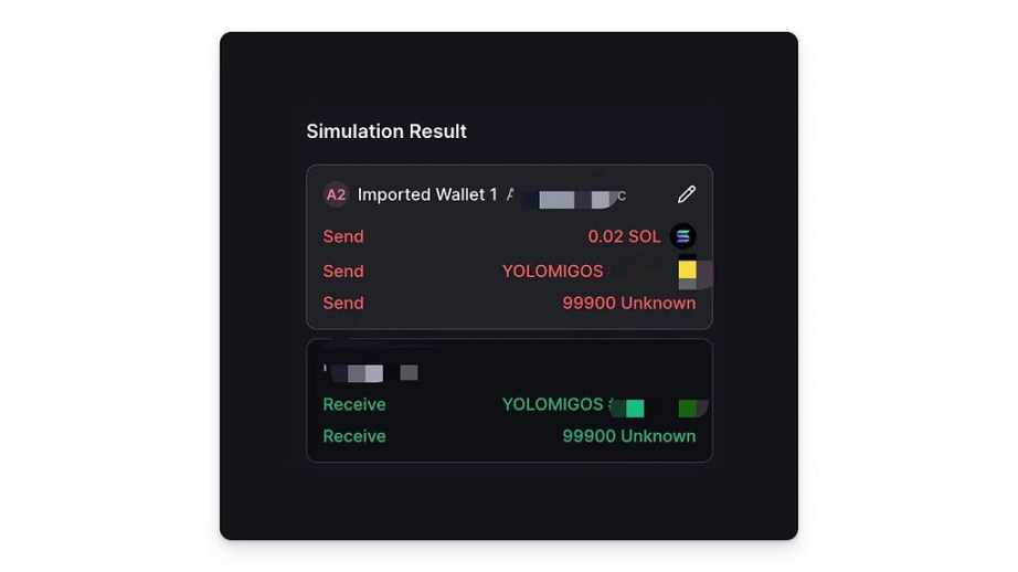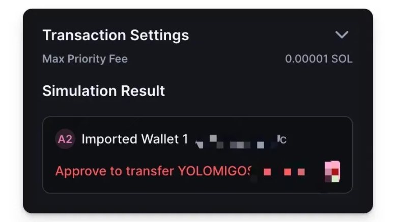 在钓鱼诈骗中,骗子可能会滥用 Durable Nonce 机制,诱导用户签署看似正常但实际上包含恶意操作的交易。由于使用了 Durable Nonce,这些交易不会因为区块哈希过期而失效,给骗子更长的时间窗口来执行交易。例如,骗子可能会设计一个伪装成合法操作的交易,如参与空投或活动,但实际上交易中包含了将用户资产转移给骗子的指令。用户在不知情的情况下签署了这样的交易,但用户会发现在区块上根本没有该交易的发生,因为攻击者只是拿到了该交易的签名,交易本身并没有被发送到区块链上,他们可以在之后的时间里随时将交易广播上链。但是,无论交易是否发生,我们发现这种类型的签名并不会影响交易模拟的结果判断,几个主流钱包依旧能够将交易本身进行模拟和解析并且告知结果,因此我们之前对于交易模拟结果的判断还是有效的方法论。