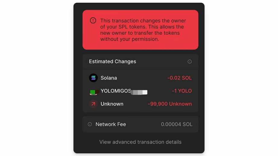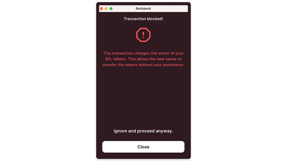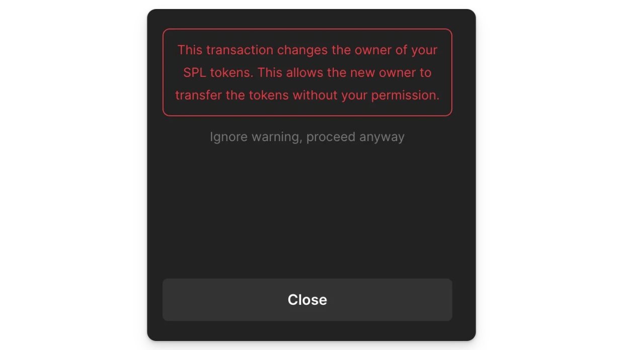 除了直接代币外,GoPlus 还发现了部分的钓鱼网站采用了createSetAuthorityInstruction的操作将 instruction 打包进交易中,该操作的本质是将账户上代币的所有权进行转移,Solana 的账户模型和 EVM 有所不同,每一个账户地址对于每一个代币,都会有一个专门的Token Account对应,Token Account 会有一个 owner,该 owner 就是当前的账户,Token Account同时记录了对应 Token 的余额和相关信息。而createSetAuthorityInstruction操作可以直接将当前代币的所有权转给另外一个账户,实际最终的效果等同于将当前的代币全部转给了该账户。我们分别在Phantom和Backpack上进行了该操作实验,庆幸的是,这两个钱包都进行了特别的提醒和警告。