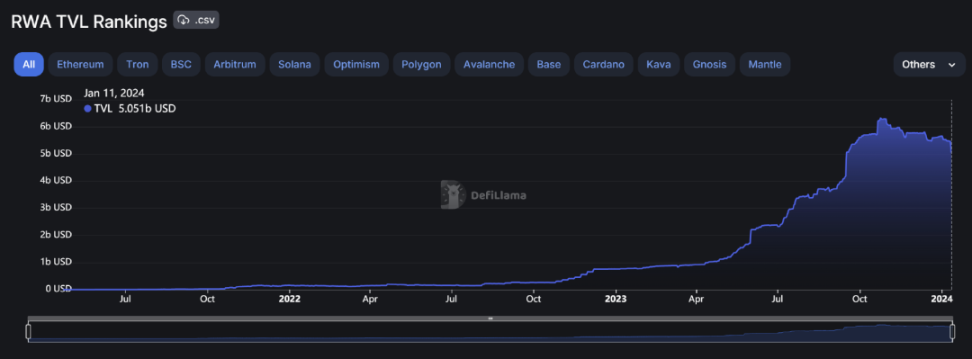 整个 RWA 市场的 TVL 也从 2023 年初的 7 亿扩容了 7 倍,达到了 50 亿美金。
