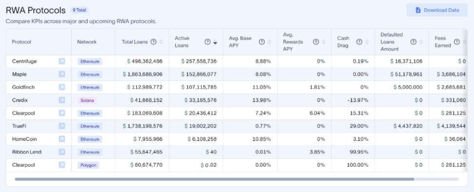 波卡生态中的 Centrifuge 也在 RWA 中的私人信贷(Private Credit)中位居 Active Loans Value 排行第一,并且从 2023 年初的 8000 万美元稳步增长到了 2.5 亿美元的体量。