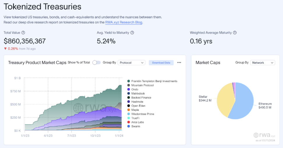 此外,在 RWA 领域,并不是从 0 到 1,而是已经有非常多 RWA 的应用发展了数年,除了稳定币以外,近些年美国国债的高收益也让美国国债类 RWA 项目持续稳健的增长,其市场份额从 2023 年初的 1 亿扩容了八倍多,目前达到了 8.6 亿美金。