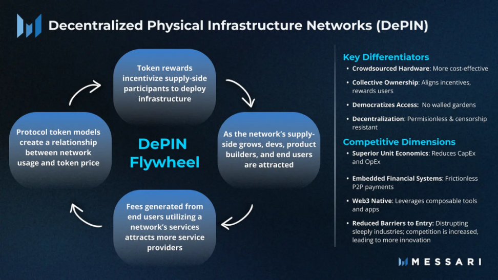 DePIN 一词最早由 Messari 于年初提出,并通过研究报告 The DePIN Sector Map 正式定义,并为这一概念描绘出基本的版图。DePIN 的核心目标是通过加密经济协议,在现实世界中部署物理基础设施和硬件网络,借助区块链的激励机制来推动各方参与者共同建设这一网络。