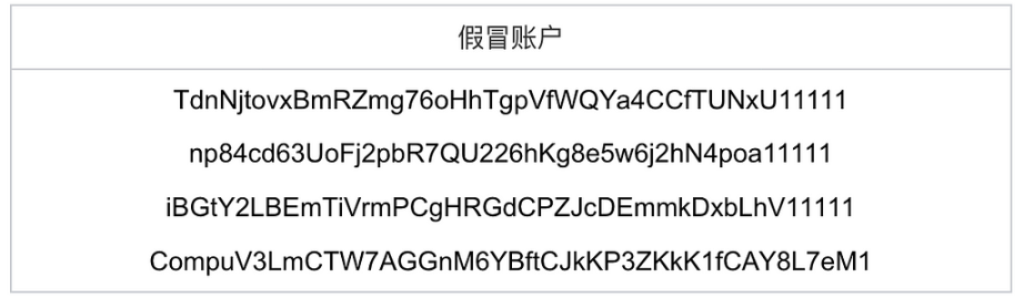 Solana 使用独特的前后缀(如 Compu、1111 等)区分系统官方账户与其他账户。部分钓鱼者利用这一特点,生成系统账户相似的靓号地址(即包含特定前后缀的地址),并诱导受害人签署与这些假冒地址交互的交易。下表列出了一些被举报的假冒系统账户的账户地址,由于大部分钱包软件只显示交互对象地址的部分前缀和后缀,受害人在进行交互的时候可能没有仔细检查便误以为交互对象是官方账户并信任交易。