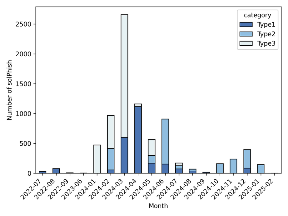 2024 年 1 月到 2024 年 6 月是钓鱼交易的高峰期,我们检测到的钓鱼交易主要集中在这半年内,并且在 2024 年 3 月份达到最高值。这可能与 Solana 的快速发展相关,2024 年是 Solana 市场复苏的一年,其用户活跃度在这一年大幅提升,原生代币 Sol 价值也在上半年整体展现出良好的上升趋势。不过,随着一些钓鱼者被揭发、多家安全公司关于警惕钓鱼诈骗的推文发布,2024 年下半年钓鱼情况有所缓和。