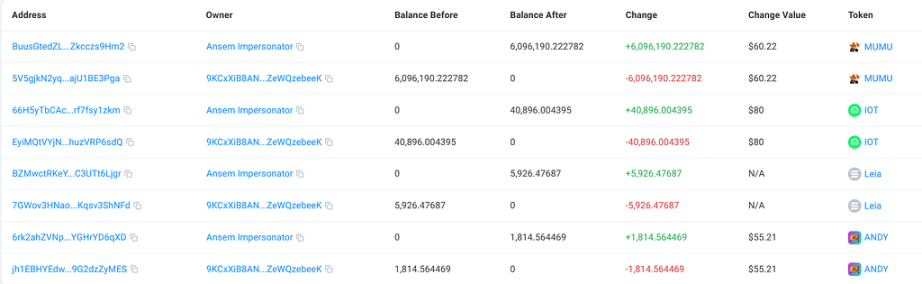 Solana 一笔交易可以包含多个指令,不同的指令可以实现转账、创建账户等不同功能。基于这一特性,钓鱼者不需要为每种代币都设置一笔单独的转移交易,而能够通过在一笔恶意交易中包含多个 transfer 指令来实现受害人钱包洗劫。例如,下面展示的一笔钓鱼交易,通过包含多个 transfer 指令,实现了对受害人四种代币的洗劫。
