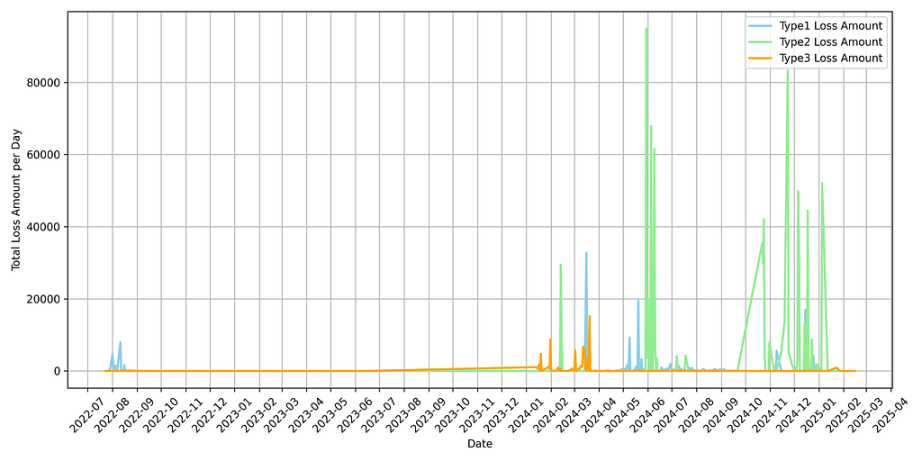 我们将根据交易发生的时间,以月份为单位统计各个月份检测到的交易数量。各个月份三种类型的钓鱼交易数量如图 1 所示。