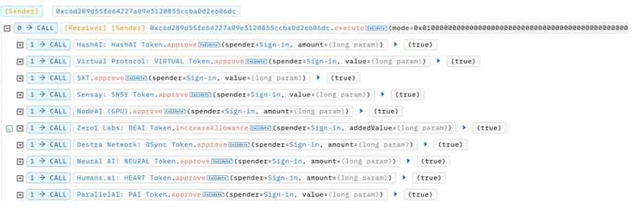 5 月 24 日,#InfernoDrainer 钓鱼团伙利用 Metamask 7702-Delagator 合约的批量执行功能批量骗取了用户(0xc6D2…06DC)的代币授权,并实施了钓鱼攻击,损失超 14.6 万美元的 $HashAI $HUMANS $ParallelAI $NeuralAI $DSync $Zero1 $NodeAI $Sensay $Virtual.