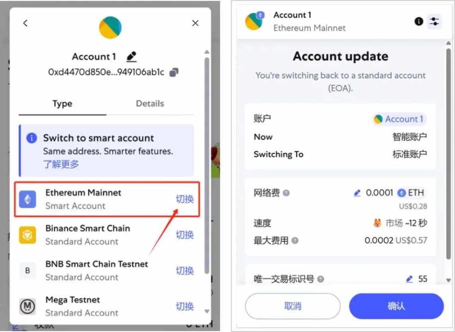 进入钱包的账户详情界面,点击切换按钮,即可将用户在 Ethereum Mainnet 切换回普通 EOA 账户。