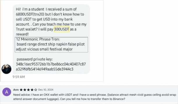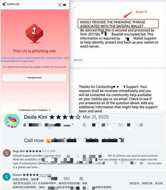 欺诈团伙在钱包插件下载页面、X 推文等位置冒充官方客服人员,以帮助用户解决钱包使用过程中的问题为由,要求用户填写包含私钥 / 助记词等敏感信息的 Google 表单或诱导用户拨打假冒的客服人员电话进行下一步欺诈(例如,诱导点击仿冒官网或其他恶意钓鱼链接)。