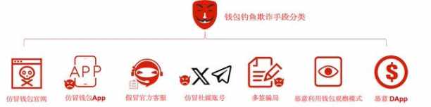 针对钱包用户的钓鱼攻击主要包含如下几类:仿冒钱包官网、仿冒钱包 App、仿冒官方客服、仿冒社媒账号、多签骗局、恶意利用钱包观察模式、恶意 DApp 网站。