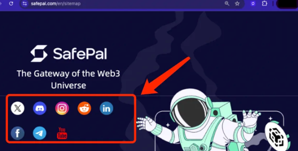 请用户保持警惕,认准 SafePal 官网的 Site Map 中的社媒入口: