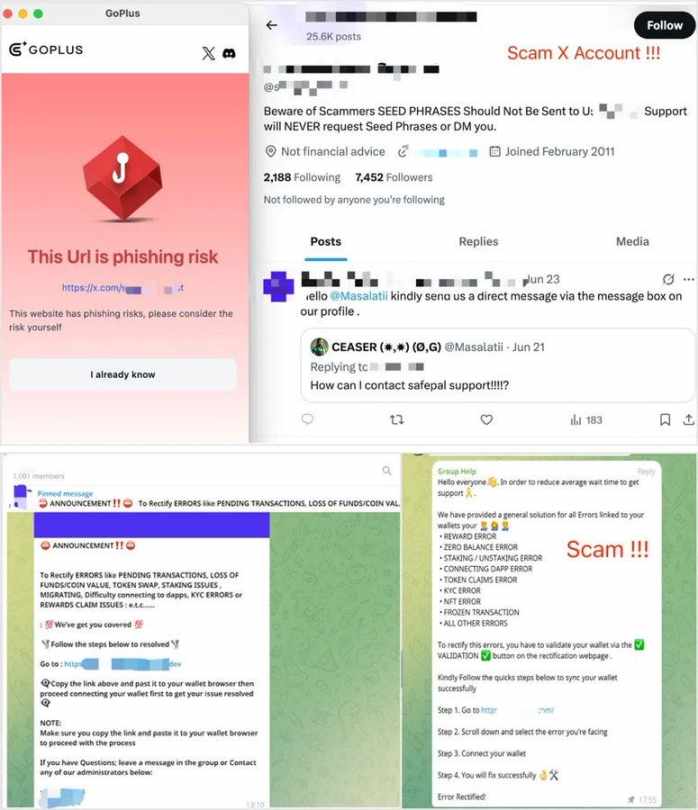 欺诈团伙注册仿冒官方的 X 账号或 Telegram、Discord 等社群,选择合适的时机发布钓鱼网站,诱导用户访问并实施欺诈。尤其需要注意的是,这类欺诈社媒账号通常会长期运营,骗取用户信任,并在关注者达到一定数量时实施欺诈。