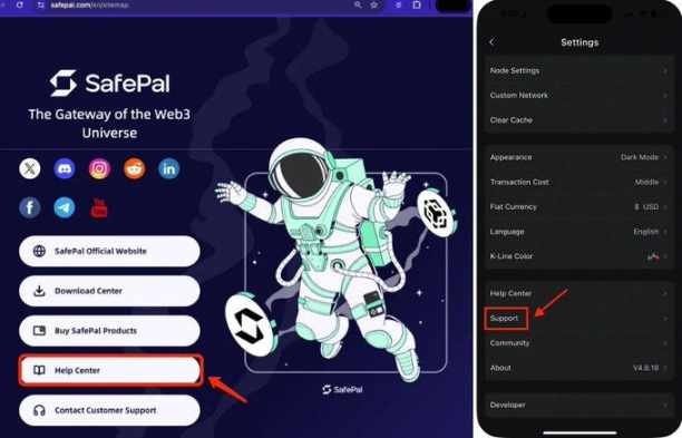 请勿随意点击非官方渠道的链接。一般在项目方官网可以找到联系客服的入口,以 SafePal 为例,官方客服入口位于官网的 Site Map 以及 App 中的”设置” — “帮助”菜单。