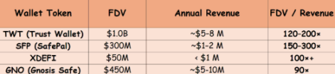 若参考同类钱包代币($TWT、$SFP、$GNO),通常 FDV/Revenue 倍数可达 100 倍以上。