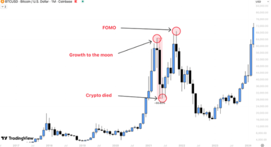这些阶段往往伴随 50%-80% 的回调,每次都被认为是加密的“终结”,但事实证明,它们仅仅是新一轮上涨的前奏。