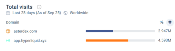 如果 Aster 的交易量真是 Hyperliquid 的 10 倍,理论上网站访问量也应接近 10 倍。然而数据显示:过去 28 天,Hyperliquid 访问量为 460 万,而 Aster 仅为 290 万。