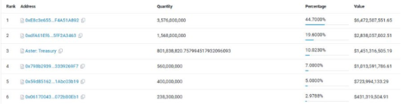 $ASTER 的供应高度集中,90% 代币掌握在 6 个钱包中,且存在明显的链上关联。根据官方分配计划,53.5% 将用于空投,目前仅 8.8% 已释放,另有 4% 将在 10 月 5 日发放。