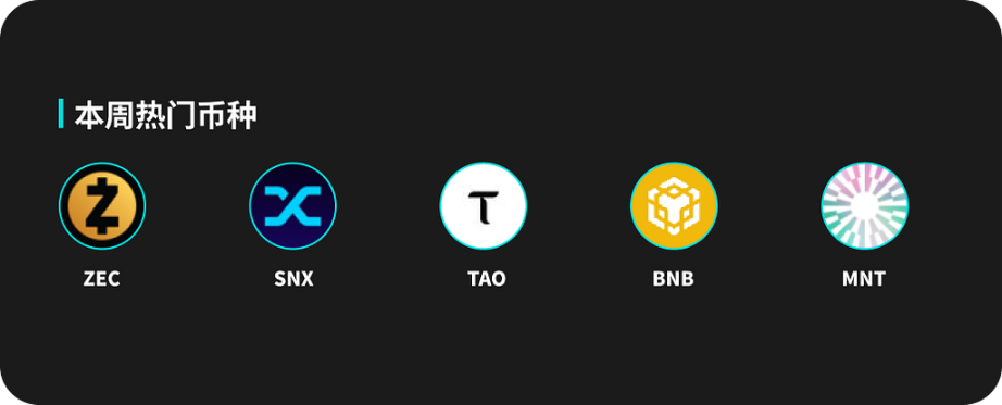 热门币种方面,ZEC、SNX、TAO、BNB 和 MNT 都有着不俗的表现。ZEC 本周价格上涨 71.8%,24 小时交易量 88M。SNX 价格上涨 65%,最高价格为 294.75 USDT。TAO 和 BNB 本周分别上涨 31.2% 和 10.8%。