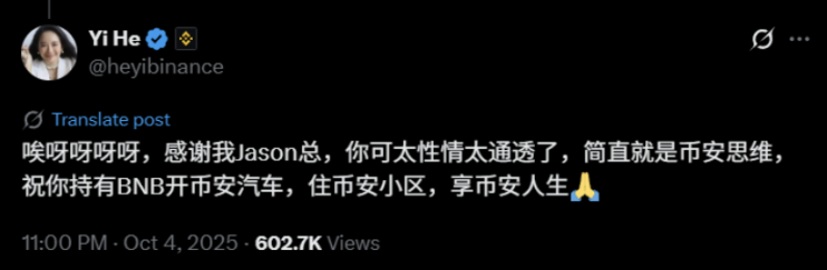 “币安人生”不仅是一句调侃,更迅速演变为整个加密社区的文化现象。它源自中文网络语境中的“苹果人生”——一种关于身份与阶层的网络讽刺——并在迁移到加密世界后,借用币安生态的体量与影响力,赋予了新的含义:既是财富神话的象征,也是市场波动与自我解嘲的集合体。与传统的 Web3 梗不同,“币安人生”的出圈并非只停留在社交层,而是伴随着币价与生态资产的真实暴涨:自 10 月 4 日上线以来,同名 Meme 币在短短几天内从 0.001 美元飙升至 0.5 美元上方,市值一度突破 5 亿美元,财富效应的爆炸式传播,让这句原本带有戏谑意味的口头禅,从笑谈变成了投资者的狂欢标语与情绪锚点。币安创始人赵长鹏与何一的亲自互动进一步把热度推至顶峰:点赞、转发以及“狗狗币就是靠打赏文化壮大社区”的调侃,使得整个社区的叙事从“玩梗”转向“造梗”,在强互动的推动下,资金与情绪迅速涌入 BNB Chain,带动“币安钱包”“币安广场”“币安社区”等一系列跟风项目与衍生 Meme 的集中爆发,形成了从中心叙事到边缘复制的快速外溢效应。