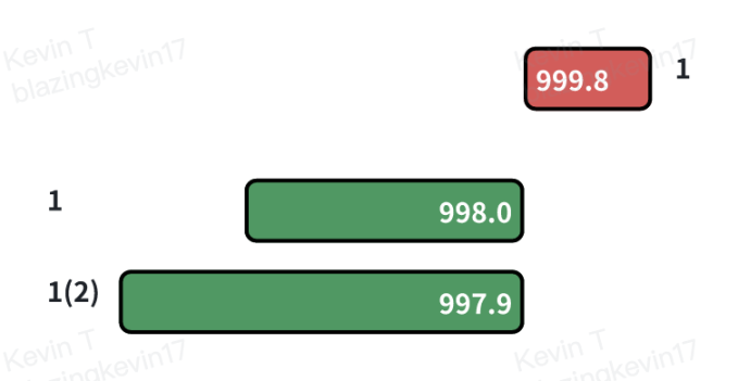 方案三:扩大价差,管理现有头寸 做市商可以采取非对称的报价策略:将卖一报价调整至一个相对不具吸引力的价位(如图 $998.8),同时将新的买单挂在更低的价位(如 $998.0 和 $997.9)。 此策略的目标是通过后续的交易来管理并降低现有头寸的平均成本。