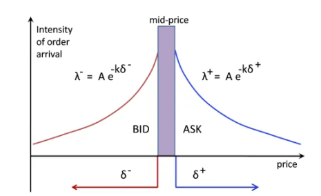 该模型的核心思想是,当做市商的库存 (q) 偏离其目标(通常为零)时,模型会系统性地调整报价中轴,以激励市场成交能使其库存回归均衡的订单。例如,当持有多头库存 (q>0) 时,模型计算出的 r(s,q,t) 将低于市场中间价 s,这意味着做市商会将其买卖报价整体下移,使得卖单更具吸引力,买单更不具吸引力,从而增加平掉多头库存的概率。
