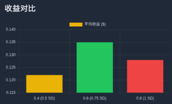 C. 寻找最优解 通过对不同价差进行迭代计算,可以发现:价差 $0.2 预期收益约 $0.08;价差 $0.4 预期收益约 $0.122;价差 $0.6 预期收益约 $0.135;价差 $0.8 预期收益约 $0.128。结论是在此模型下,最优价差为 $0.6,即在距离均价 $0.3 ( 约 0.75σ) 的位置挂单,能实现期望收益的最大化。