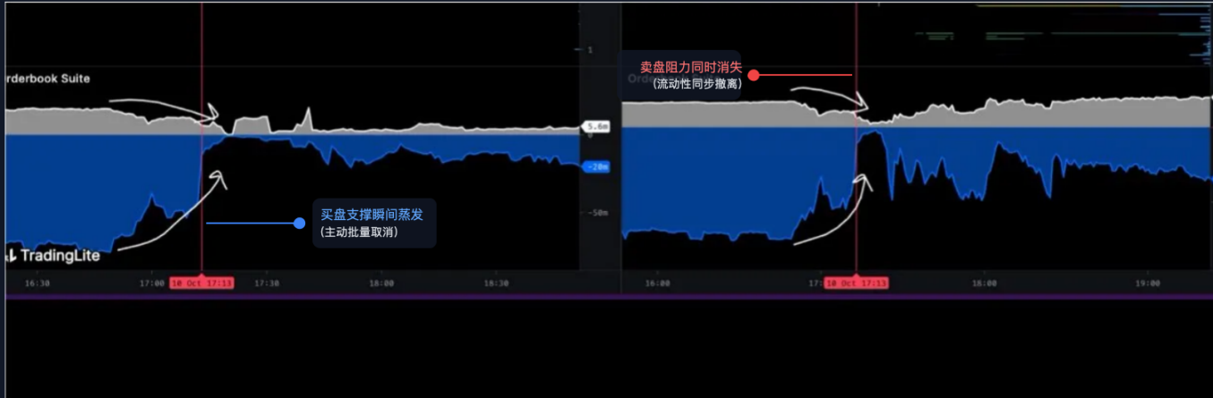 买盘支撑的瞬时蒸发:图表下方的蓝色区域出现了一个巨大的、近乎垂直的“断崖”。这种形态与买单被大量成交所消耗的情况完全不同——后者应呈现出流动性被逐级、渐次侵蚀的形态。而这种整齐划一的垂直消失,唯一合理的解释是:大量的限价买单被主动、同时、批量地取消了。