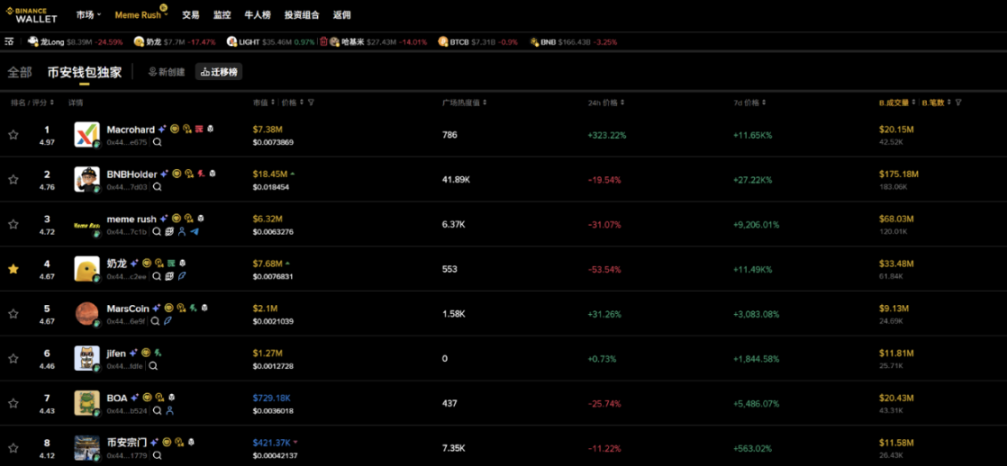 在新一轮 BSC Meme 热潮中,MemeRush 成为最具代表性的项目。依托币安 Wallet 体系的 Keyless(无密钥)钱包、轻社交绑定与合规化发行路径,它构建出从注册到持币仅需数秒的闭环式通道,大幅降低 Web2 用户进入 Web3 的门槛。MemeRush 的出现恰逢“中文 Ticker”风潮,这一符号化细节意外成为“BSC 季”的情绪引爆点,象征着币安对 Meme 文化的正式支持,也使亚洲语境成为全球 Meme 新叙事的中心。更深层的创新在于,MemeRush 通过 Four.meme 协议打通币安内盘,将准入门槛提升至一百万美元,在不改变规则的前提下显著提高控盘与发行难度;同时结合“一人一地址”的钱包机制,使币安能够精准识别和绑定链上活跃用户,形成身份、数据与资产的闭环,推动生态建立真正的内循环模型。这背后体现出币安正将传统金融的“预期管理”逻辑引入链上体系。新的上币路径从 MemeRush 内盘、外盘,再到 Aster 与 BN 系列产品,构成多阶段释放价值、分层维系情绪的生态链条。币安不再只是流量终点,而逐渐演变为驱动市场节奏、调控情绪预期的核心中枢。MemeRush 因此不仅是发射平台,更是让情绪结构化、让文化具备流动性的实验样本。