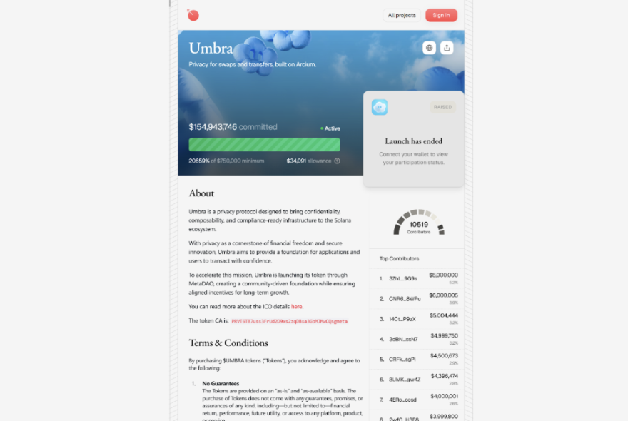 在加密融资机制不断演化的当下,MetaDAO 正在 Solana 上开启一场关于 ICO 的全新实验。2025 年 10 月,隐私协议 Umbra 在 MetaDAO 平台完成社区销售,短短数日吸引逾一万名用户参与,认购金额高达 1.55 亿美元,为计划融资额的 200 倍。最终,项目方仅接受了 300 万美元上限,剩余资金全额退回。这场“自限式募资”不仅在公平与安全性上树立标杆,也让市场看到了由规则约束驱动的融资模式可能性。更具象征意义的是,Umbra 代币上线后价格较发行价上涨四倍,而 MetaDAO 自身代币 META 市值一度突破两亿美元,显示出资本对这一制度创新的高度认可。MetaDAO 的核心设计是将 Futarchy(预测市场治理) 引入 ICO,使决策从传统的投票机制转变为由市场判断驱动。每个提案都会创建条件市场,让参与者通过押注项目价值的上涨或下跌表达判断,从而由市场价格决定提案成败。与此同时,所有融资资金将被锁入治理金库,创始团队的代币按照价格目标分级解锁,只有当代币价格依次达到 2 倍、4 倍、8 倍、16 倍、32 倍时,团队激励才会释放,确保项目成功与激励紧密绑定。从本质上看,MetaDAO 不再是一次简单的发行工具,而是一种以市场机制驱动的长期治理架构,为加密世界的公开融资提供了新的制度模板。